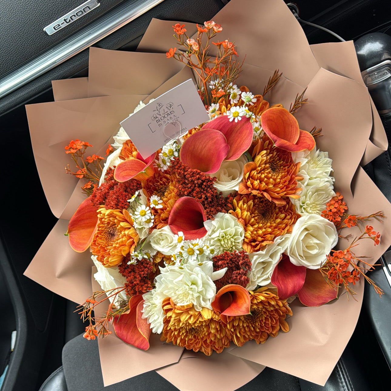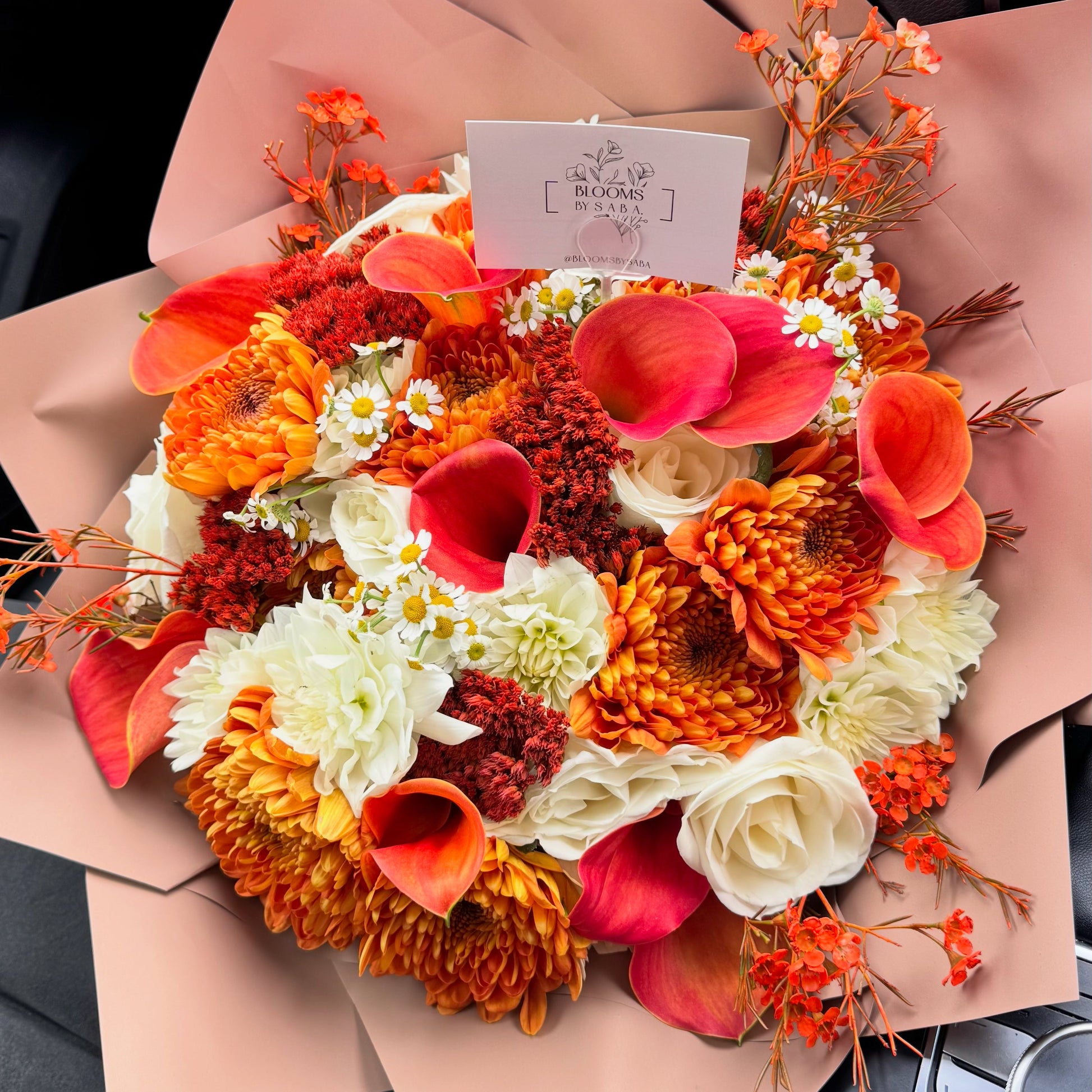 The Autumn Sunset Bouquet radiates luxury and warmth with rich amber, crimson, and golden blooms accented by delicate white daisies. Elegant, vibrant, and timeless — a stunning reflection of fall’s golden glow.