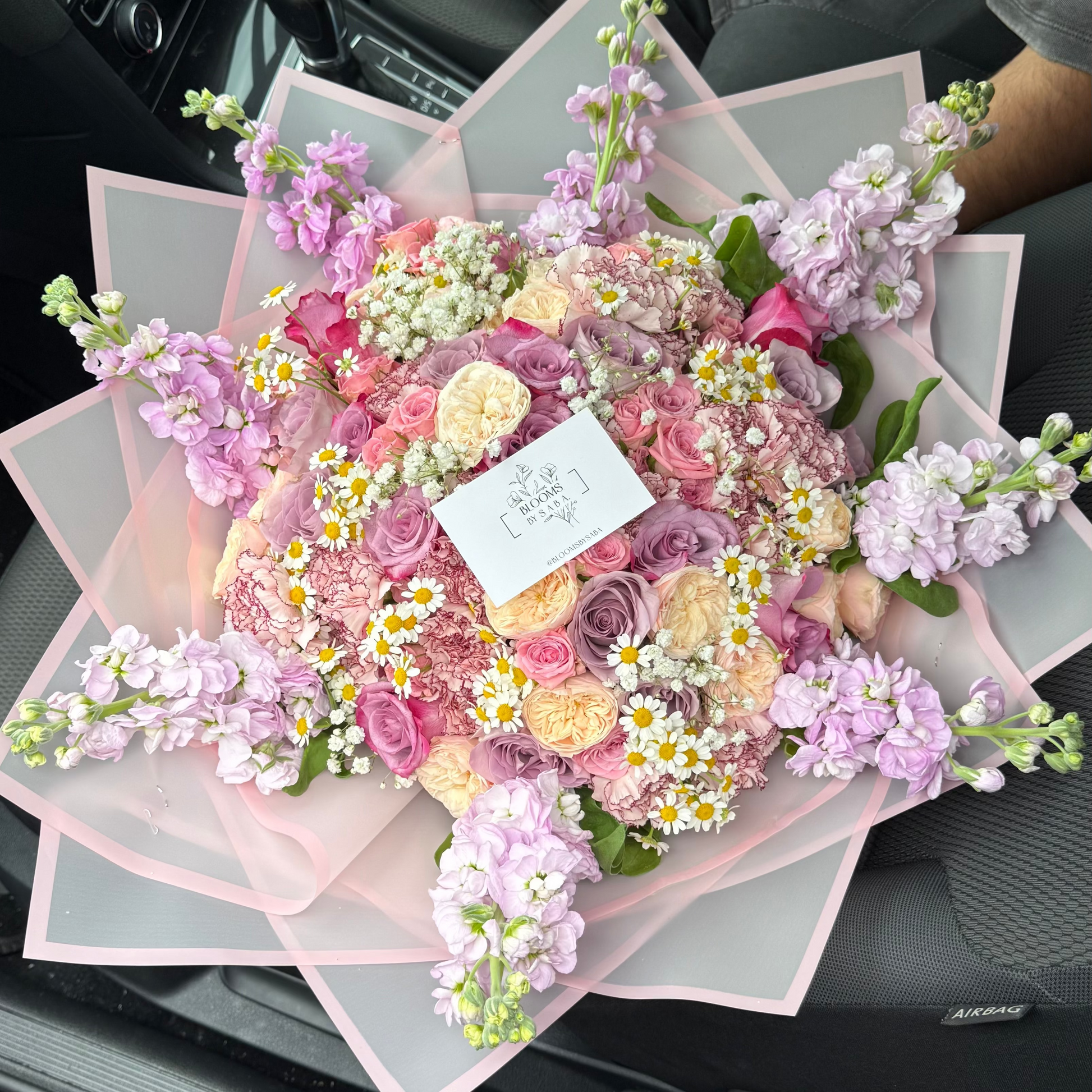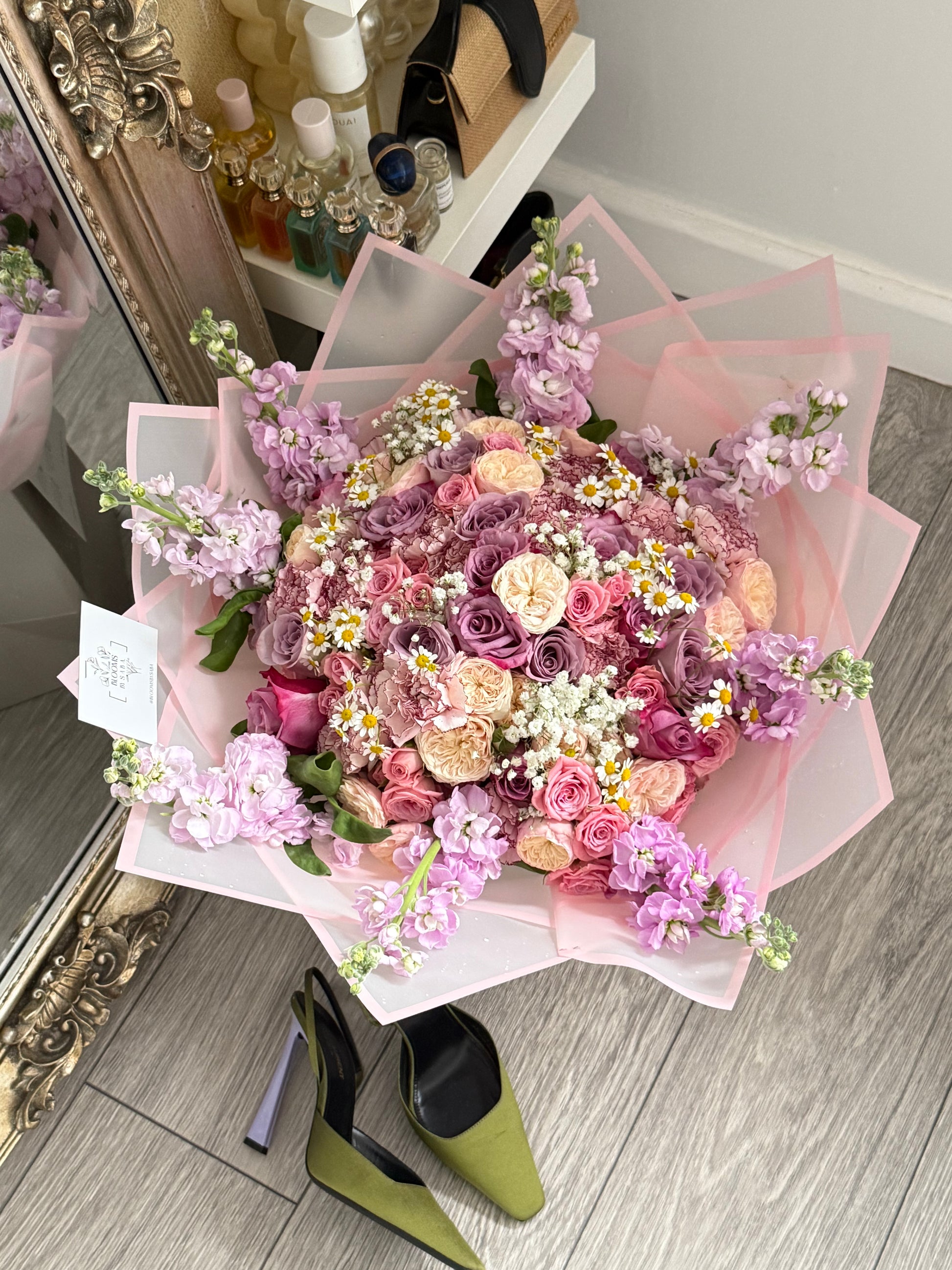 A charming bouquet of lilac blooms in shades of purple and pink, accented with bright white daisies. Soft, fragrant, and romantic — a perfect blend of elegance and springtime cheer.