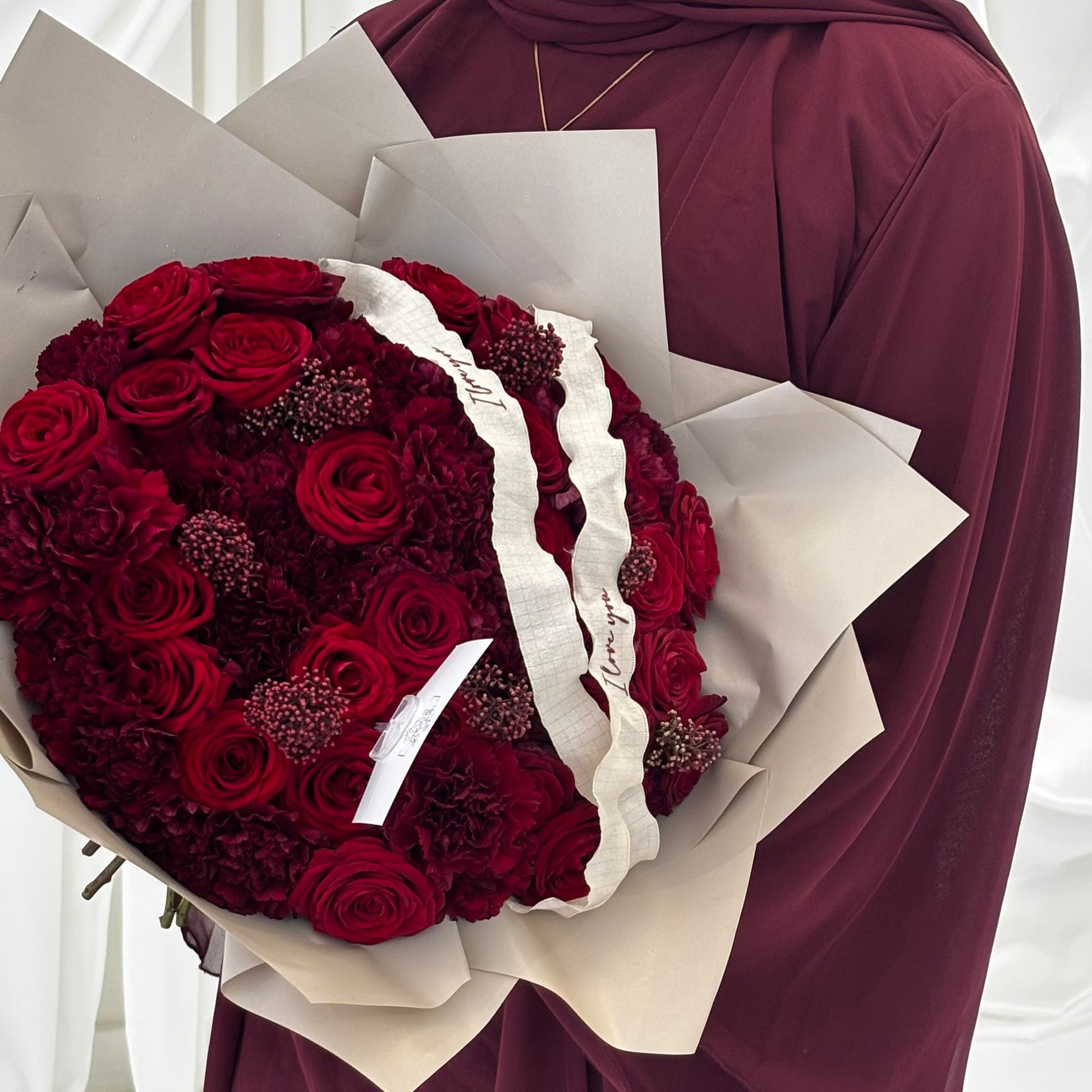 A timeless bouquet of rich red roses and soft carnations, hand-arranged to express love in its purest form. Finished with an “I love you” ribbon, this arrangement is made for heartfelt moments, unspoken emotions, and the kind of love that lasts forever.
