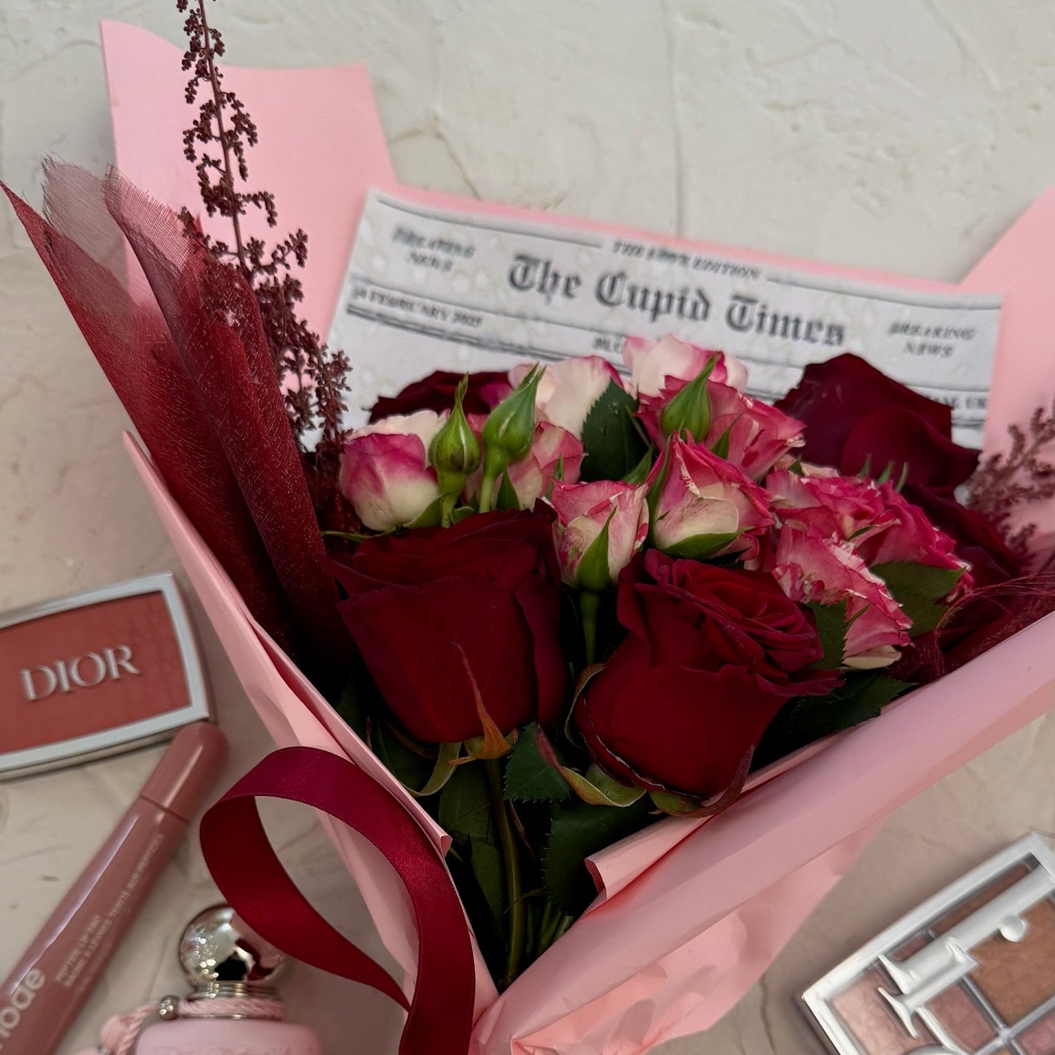 A charming mini bouquet of deep red and blush roses, wrapped in soft pink and finished with a rich ribbon. Petit Amour is a small gesture with a big heart — perfect for love notes, thoughtful surprises, and moments that deserve something beautifully intimate.